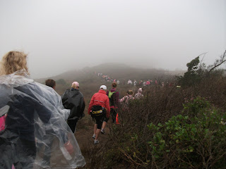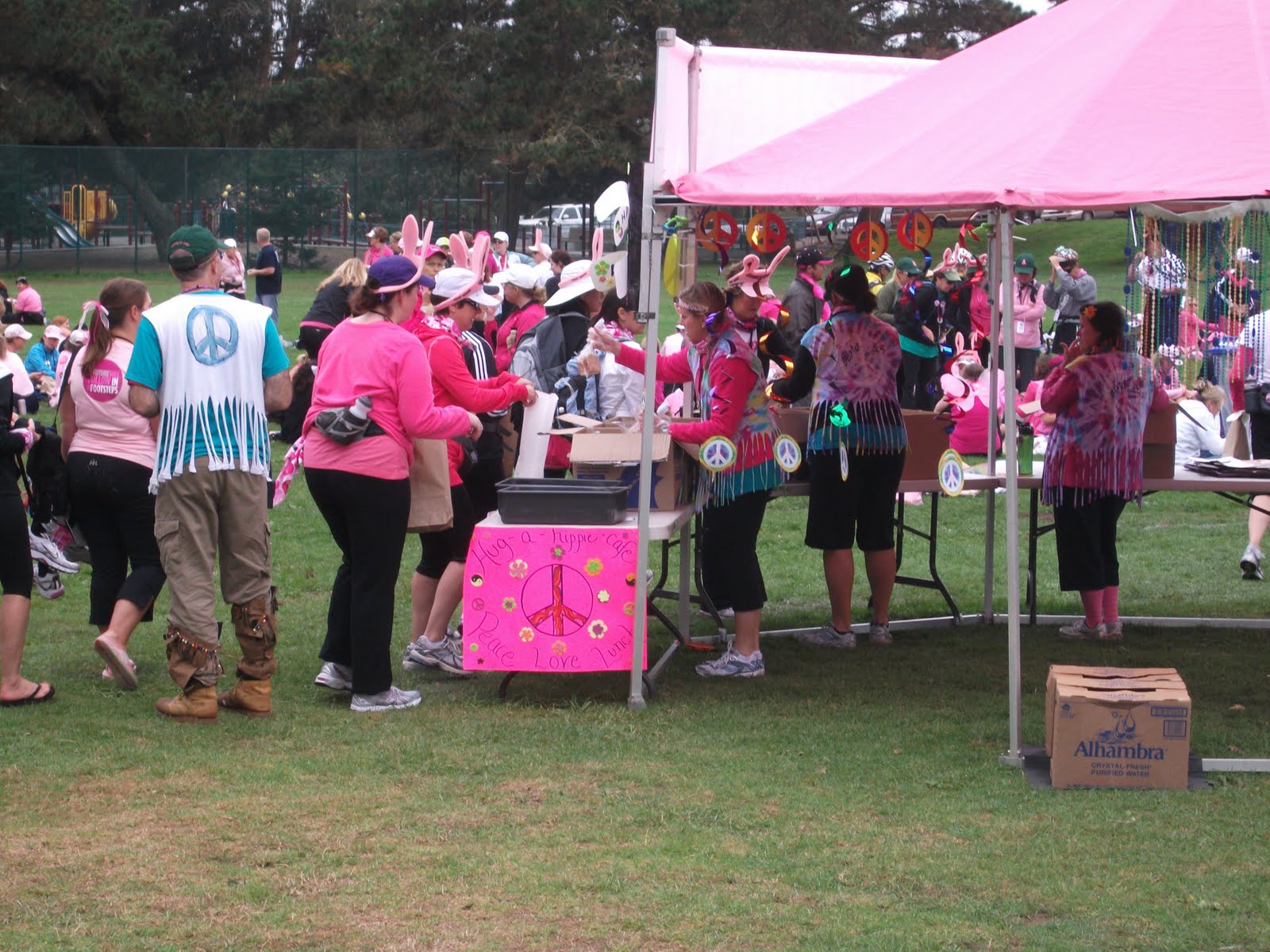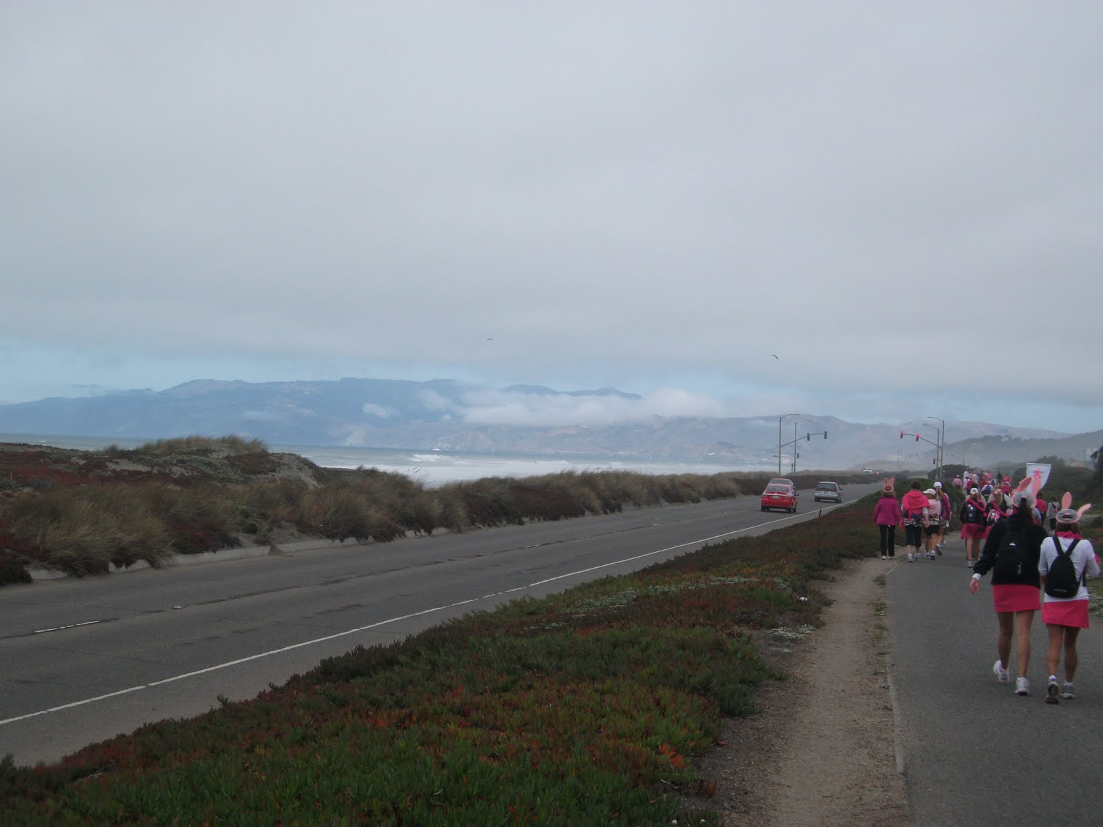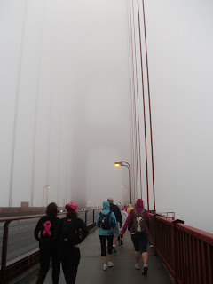 Last year our pink pup tent camp was in Crissy Field, at the base of the bridge. This year, due to forecasted high winds, we set up on the grounds of The Presidio instead. Sunday morning I crawled out of my tent to find that the heavy fog had lingered overnight. The morning was crisp and pleasant. I dressed and prepared my pack for the day. I packed up my things and dropped my duffle bag at the appropriate truck, thankful that I had managed to get everything to fit into it again. The trucks would be waiting at the site for the closing ceremony. Dave and Aaron would pick up my bag for me so that I didn’t have to lug it around later on.