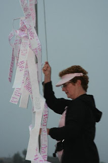There was a new part of the opening ceremony that I participated in this year. This long table had strip after strip of white paper cut into ribbon-like pieces. We were invited to add the names of our family, friends and loved ones who had been touched by breast cancer to one of the strips. During the opening ceremony, these strips became flags on the flagpole up on the raised stage in the middle of the ceremony area. In this way, all of the survivors who were part of our lives became an honorary part of the opening ceremony and of the whole weekend event.