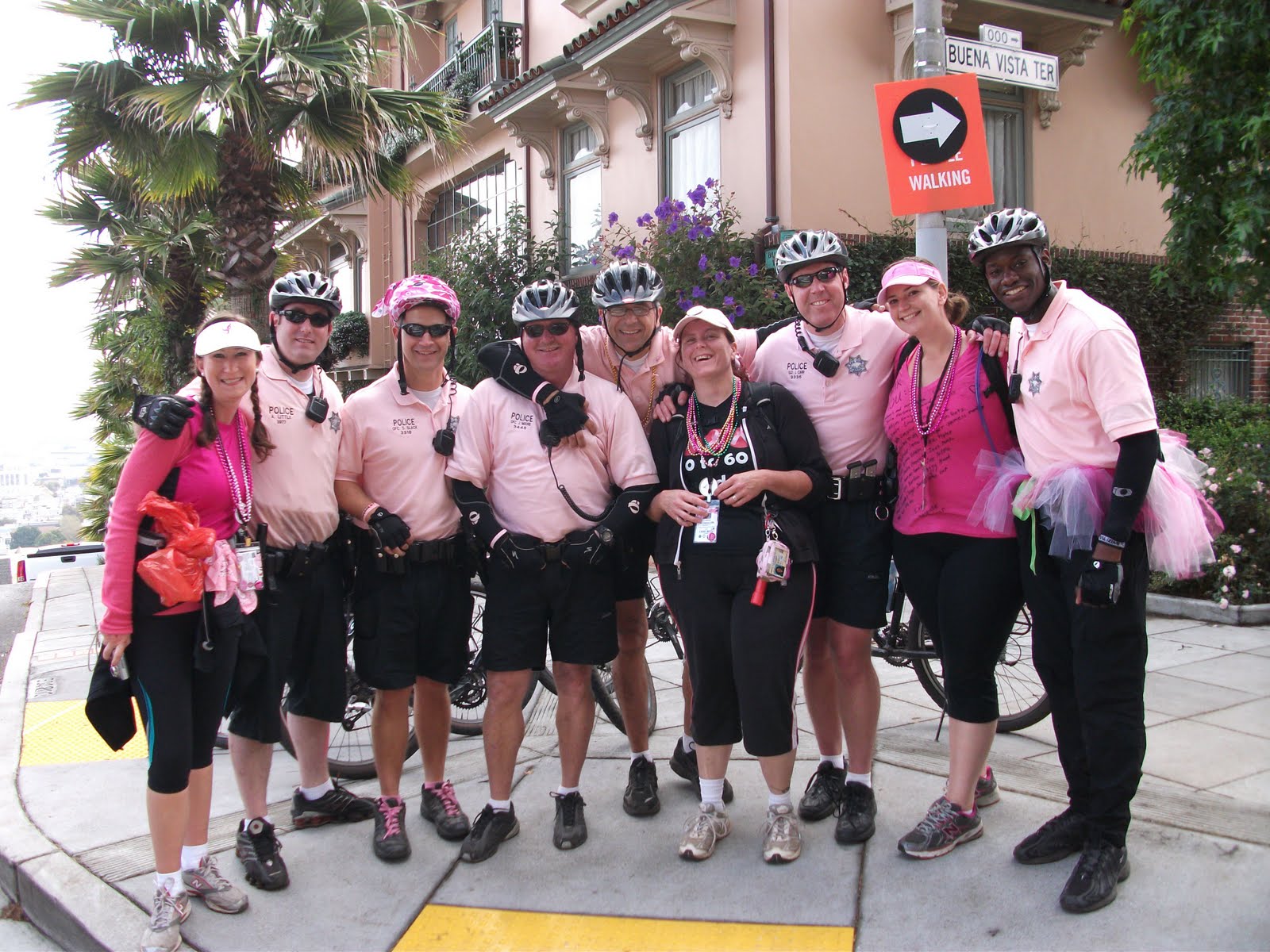 The San Jose and San Francisco Bike Cops are our constant companions. They provide safety, especially at busy intersections or along paths where the sweep vans can’t reach us. They provide so much more though. This all volunteer crew spends the entire weekend with us, providing music, chatting with the walkers, giving encouragement, checking in with those who might be lagging behind to make sure they’re OK, etc. They wear their pink bandannas, hats, tshirts, even boas and tutus, with great pride. They are as committed to the cause as the walkers are and it’s an honor to have them with us.