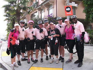 Once we crossed the bridge, we made our way down the winding hill to Fort Baker for our first Pit Stop of the day. A group from the Coast Guard greeted us. They were dressed in pink, provided inspirational music and even had pink balloons decorating their rescue boat and their doggie mascot. Their presence seemed to be very inspiring, especially to the many women in the group.
