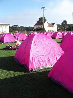 Looks simple enough, right? Having not been a boy scout, and having only a short stint as a girl scout, I’ve never actually set up a tent before. With the written instruction and little practical help from a member of the crew, my home away from home was established, just one in the midst of a sea of hot pink pup tents. Once I had strategically placed my gear around the tent in hopes that the winds there on the grounds of the Presidio wouldn’t turn my tent into big, pink tumbleweed, I took my things and got in line for a much appreciated nice, hot shower. A quick chat with Dave and I was off to sleep. Day 1 complete.