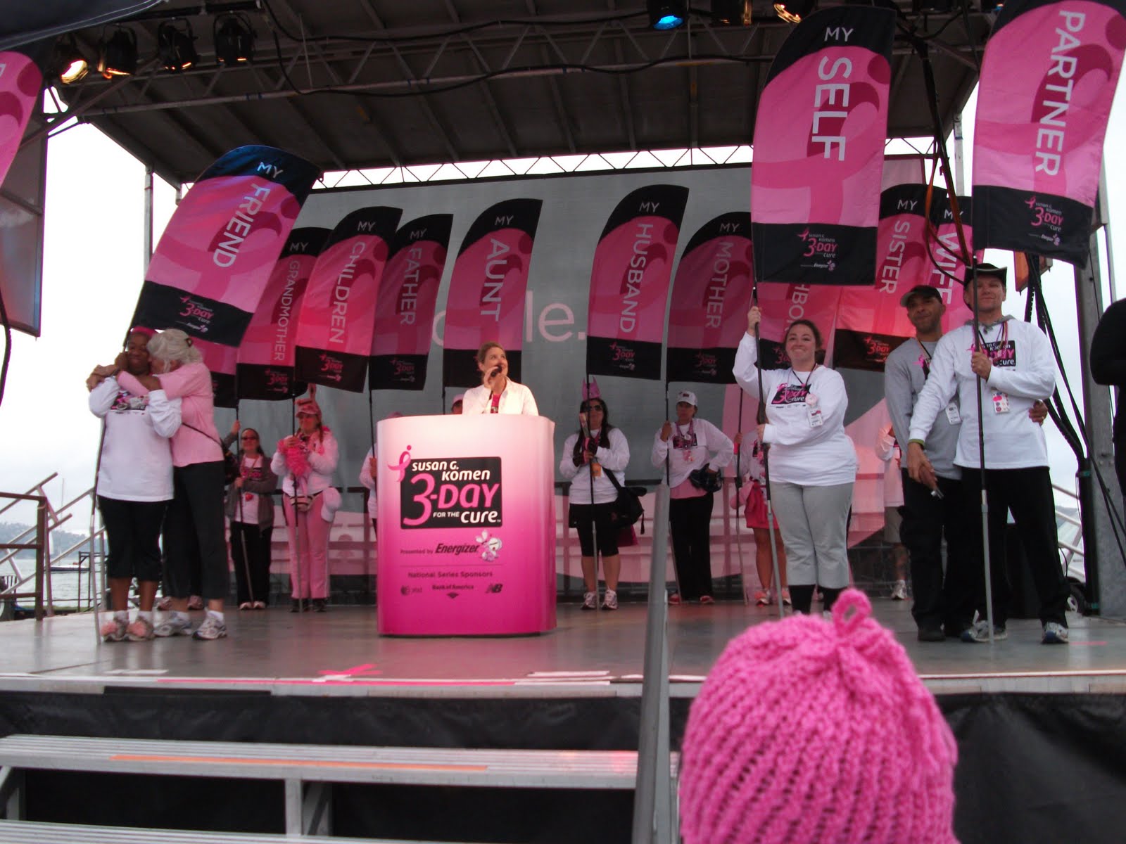The honor guards filed on stage, carrying the memorial flags. This is one of the most touching moments in the ceremony. For most of the walkers and the people gathered there, the flags represent people, loved ones, whose lives were touched by breast cancer. Tears began to flow. There were 4 honor guards standing on the front of the stage. Their flags read, “My Partner”, “Myself”, “My Friend” and “My Daughter.” As the crowd cheered, those honored by the flags joined them – partner, friend and daughter. The tears flowed freely all around.
