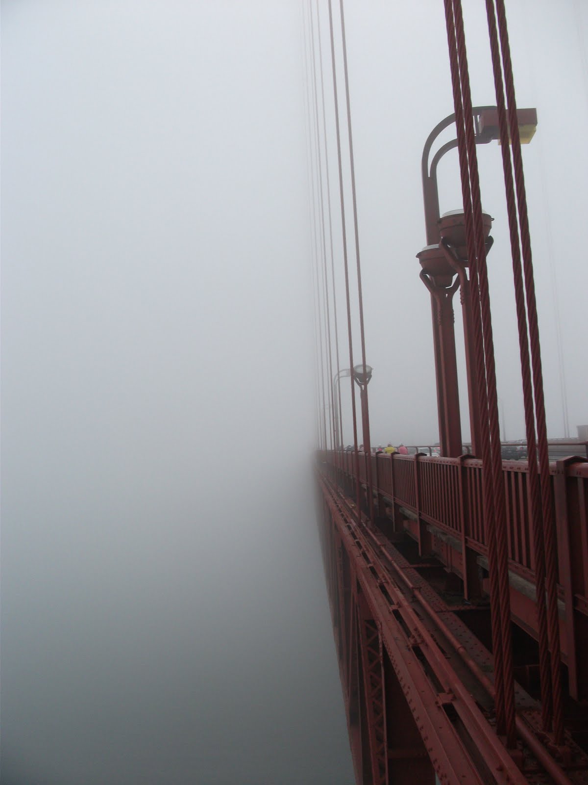 By this time of day, the fog had rolled back in. It was a thick, heavy fog and it brought some pretty steady winds with it. The wind was in our faces this time rather than at our backs so it seemed so much more severe. We were on our way back so at this point we’d already walked 17 miles, on top of the 20 from the day before. We were tired. Walking into the wind was difficult. The wind was so strong that the sound, combined with the noise from the traffic on the bridge, was so overwhelming that you couldn’t even carry on a conversation with the person walking beside you. The fog was thick and dense. It obscured the bridge so that you really couldn’t get a good idea of how far you had gone or, more importantly, how far you had to go to get to the other side. The combination of all of these factors made it feel like the bridge was 20 miles long!